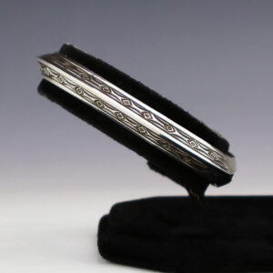 Always in style, these bracelets look fabulous alone or stacked with other bracelets. Navajo jeweler Landon Secatero made this outstanding sterling silver bracelet. Weighs 44 grams. The entire inner circumference is about 6 5/8”, including 1 1/4” opening. (Fits a 6 5/8″ wrist). Signed. tapers 1/4″ to 7/16” wide Artist...