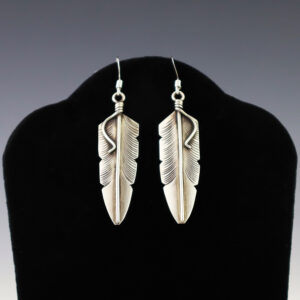 Beautiful feather earrings hand made out of sterling silver. Hand made by Navajo silversmith Chris Charley. These fabulous earrings will become a versatile accessory in your jewelry collection. Weighs 6 grams. Signed 9/16″ x 1 3/4″ 2 3/8″ long (including ear wires) Artist card included...