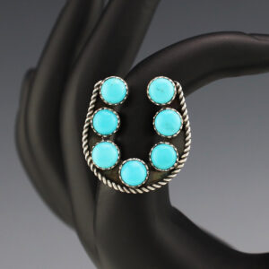 This beautiful ring was hand made by Navajo artist Geraldine James. Sterling silver with a Turquoise stone. It is a great representation of hand made Navajo jewelry. Size 7. Weighs 6 grams. Signed 9/16″ wide-stone 3/8″ wide-band Artist card included Around 1865, a Navajo Blacksmith Atsidi Sani who admired...