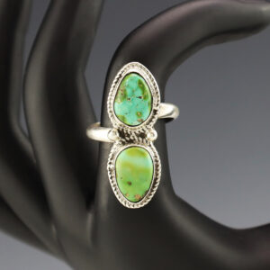 Navajo artist Darrin Livingston made this lovely ring out of sterling silver and set it with Palomino Variscite stones. It is a great representation of hand made Navajo jewelry. Size 8 1/2. Weighs 12 grams. Signed 7/16″ wide x 1 7/16″ long 3/8″ wide-band Artist card included...