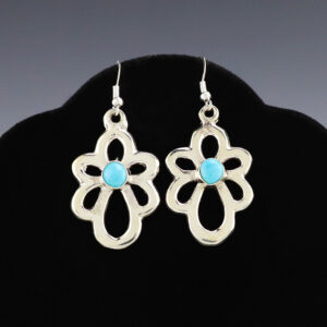 Gorgeous dangle earrings made out of sterling silver and set with Turquoise stones. Hand made by Navajo artist Erma Arviso. These fabulous earrings will become a versatile accessory in your jewelry collection. Weighs 4 grams. Signed 3/8″ x 13/16″ 1 1/4″ long (including ear wire) Artist card included...