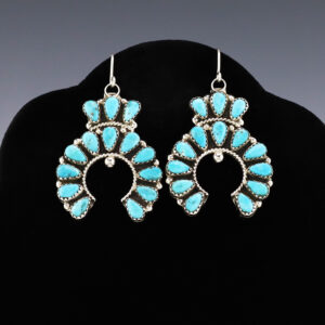 Beautiful cluster earrings made out of sterling silver and Turquoise by Navajo artist Ophelia Moses. These fabulous earrings will become a versatile accessory in your jewelry collection. Weighs 6 grams. Signed. 3/4″ x 1″ 1 1/2″ long (including ear wire) Artist card included The Navajos began...