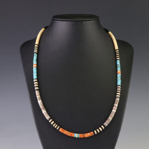 Amazing color combination! Kewa artist Lupe Lovato hand crafted this gorgeous necklace out of Turquoise and Spiny Oyster. Traditionally made by hand cutting, drilling, rolling, and stringing. Weighs 72 grams. A timeless beauty that you will enjoy for years to come. 3/16″ to 7/16″ wide 21 1/4” long ...