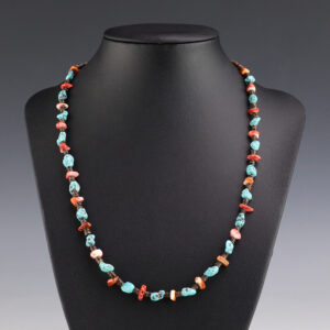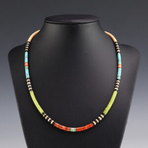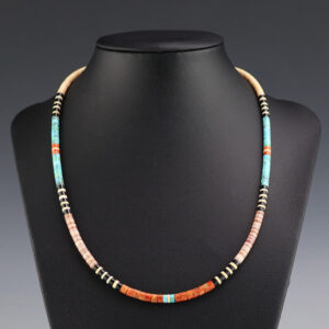 Amazing color combination! Kewa artist Lupe Lovato hand crafted this gorgeous necklace out of Turquoise and Spiny Oyster. Traditionally made by hand cutting, drilling, rolling, and stringing. Weighs 72 grams. A timeless beauty that you will enjoy for years to come. 3/16″ to 7/16″ wide 21 1/4” long ...