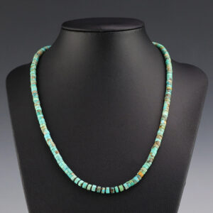 Amazing color combination! Kewa artist Lupe Lovato hand crafted this gorgeous necklace out of Turquoise and Spiny Oyster. Traditionally made by hand cutting, drilling, rolling, and stringing. Weighs 74 grams. A timeless beauty that you will enjoy for years to come. 3/16″ to 7/8″ wide 20 1/2” long ...