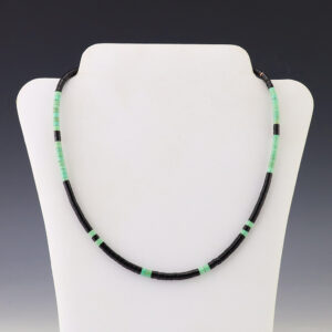 This necklace, hand made by Kewa artist Jeanette Calabaza, is a lovely statement piece. The necklace showcases fine Olive Shell and Turquoise. The strand of heishi is finished off with a hook and eye. Weighs 14 grams. 1/8″ wide to 3/8″ wide 18 1/8” long Artist card included...