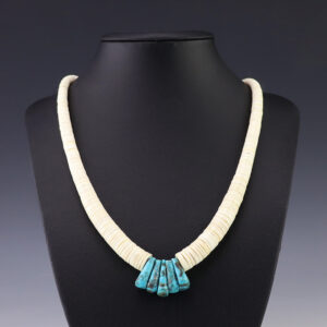 Amazing color combination! Kewa artist Lupe Lovato hand crafted this gorgeous necklace out of Turquoise and White Clam. Traditionally made by hand cutting, drilling, rolling, and stringing. Weighs 54 grams. A timeless beauty that you will enjoy for years to come. 3/16″ to 13/16″ wide 20” long Artist...