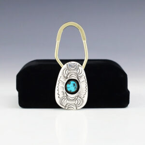 Incredibly detailed key ring made through the overlay technique. Hopi overlay is constructed from two layers of sterling silver. A design is cut out with a jeweler’s saw by hand. This top design layer is then silver soldered to another sheet, the bottom layer, of silver. Texturing is added to...