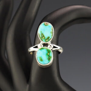 Navajo artist Darrin Livingston made this lovely ring out of sterling silver and set it with Palomino Variscite stones. It is a great representation of hand made Navajo jewelry. Size 8 1/2. Weighs 12 grams. Signed 7/16″ wide x 1 7/16″ long 3/8″ wide-band Artist card included...