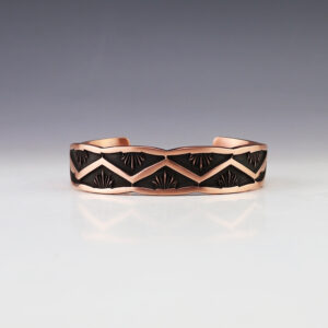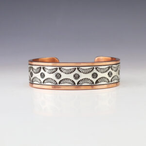 Navajo artists Randy Secatero and Sylvana Apache made this marvelous bracelet. Sterling silver and Copper with a traditional hand stamped design. Weighs 44 grams. The entire inner circumference is about 7 1/4”, including 1 1/8” opening. (Fits a 7 1/4″ wrist) Signed 3/8″ wide Artist card included ...