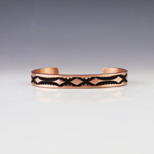 Navajo artist Wylie Secatero made this marvelous bracelet. Sterling silver and Copper with a traditional hand stamped design. Weighs 94 grams. The entire inner circumference is about 8”, including 1 1/2” opening. (Fits a 8″ wrist). Signed 3/4″ wide Artist card included The Navajos began working with...