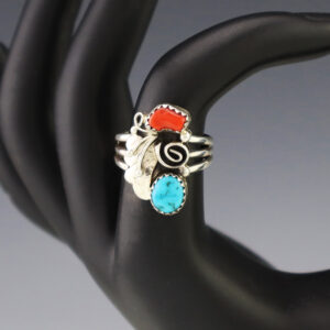 This ring is a great representation of hand made Navajo jewelry and will make a statement on your hand. Beautiful pieces of Turquoise and Coral are set into a sterling silver setting. Weighs 4 grams. Size 8. Signed 9/16″ wide x 13/16″ long The Navajos began working with...