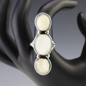 This ring is a great representation of hand made Navajo jewelry and will make a statement on your hand. Mother of Pearl Shell is set into a sterling silver setting. Weighs 10 grams. Size 10. Signed 5/8″ wide x 2″ long The Navajos began...