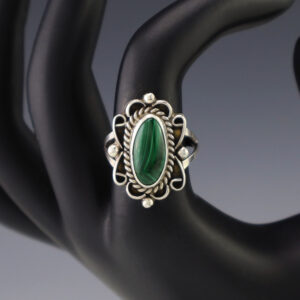 This ring is a great representation of hand made Navajo jewelry and will make a statement on your hand. Malachite is set into a sterling silver setting. Made by Navajo artist Priscilla Smith. Weighs 4 grams. Size 7 3/4. Signed 15/16″ long Artist card included...