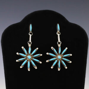 Made in the highly regarded petit point style, each earring features Turquoise stones set into a sterling silver setting. Hand made by Dixie Booqua. Weighs 10 grams. These delightful earrings will become a versatile accessory in your jewelry collection. 1 3/16″ x 3 1/8″ Artist card included Zuni Pueblo is...