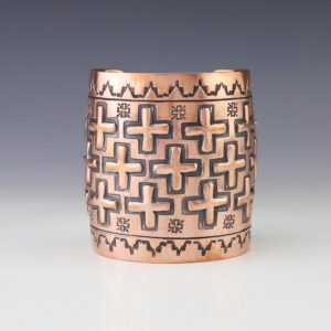 Navajo artist Wylie Secatero made this marvelous bracelet. Sterling silver and Copper with a traditional hand stamped design. Weighs 44 grams. The entire inner circumference is about 7 1/4”, including 1 3/16” opening. (Fits a 7 1/4″ wrist). Signed 3/8″ wide Artist card included The Navajos began...
