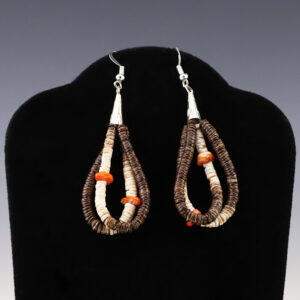 Kewa (Santo Domingo) artist Ramona Bird made these beautiful earrings out of Olive Shell. A great addition to your Native American jewelry collection. Weighs 6 grams. 13/16” wide x 2” long 2 11/16″ long (including ear wire) Artist card included Kewa (Santo Domingo) artists are known for their heishi. ...
