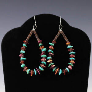 Kewa (Santo Domingo) artist, Lupe Lovato handcrafted these lovely earrings out of Turquoise and Spiny Oyster. These earrings will look fabulous with any outfit. Weighs 18 grams. 1 7/16” wide x 2 15/16” long 3 3/4″ long (including ear wire) Artist card included Kewa (Santo Domingo) artists...