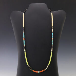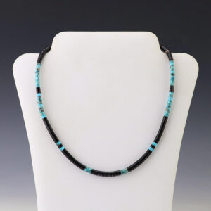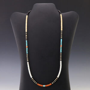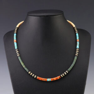 Amazing color combination! Kewa artist Lupe Lovato hand crafted this gorgeous necklace out of Turquoise and Spiny Oyster. Traditionally made by hand cutting, drilling, rolling, and stringing. Weighs 74 grams. A timeless beauty that you will enjoy for years to come. 3/16″ to 7/8″ wide 20 1/2” long ...