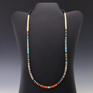 Amazing color combination! Kewa artist Lupe Lovato hand crafted this gorgeous necklace out of Turquoise and Spiny Oyster. Traditionally made by hand cutting, drilling, rolling, and stringing. Weighs 72 grams. A timeless beauty that you will enjoy for years to come. 3/16″ to 7/16″ wide 21 1/4” long ...