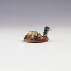 Zuni artist Darrin Boone hand crafted this stellar duck fetish. The carving is made out of Pipestone, Cowrie Shell, Mother of Pearl Shell, Serpentine, and Turquoise. A great addition to your Native American or Zuni fetish collection. Signed 13/16” tall x 1 13/16” long x 15/16” wide Artist...
