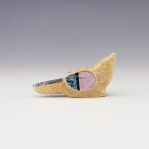 Zuni fetish artist Delvin Leekya comes from a family of carvers, and he is the grandson of Leekya Deyuse. Delvin continues to create traditional fetishes in the style of his famous grandfather. This lovely bird is made out of Travertine (Zuni Rock), Jet, Turquoise, Pink Mussel, Apple Coral, and Abalone...