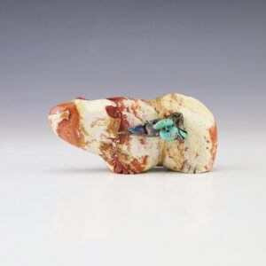 The Bear symbolizes healing and strength. Zuni artist Evalena Boone made this fabulous bear fetish. The carving is made out of Selenite and is bundled with Spiny Oyster, Penn Shell, and Turquoise. 1 1/4” tall x 3 7/8” long x 5/8” wide Artist card included Zuni fetishes are carvings made...