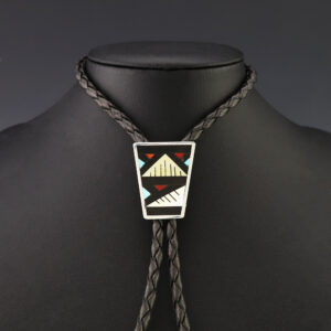 Exquisite rug pattern that features Turquoise, Coral, Jet, and Mother of Pearl Shell inlaid in a sterling silver setting. Great bolo tie that will complement any shirt. Hand made by Diana Othole from the Zuni Pueblo. High quality craftsmanship that is a great representation of the traditional Zuni inlay work. ...