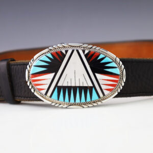 Exquisite buckle that features Turquoise, Coral, Jet, and Mother of Pearl Shell inlaid in a sterling silver setting. Hand made by Leslie and Gladys Lamy from the Zuni Pueblo. Outstanding design. High quality craftsmanship that is a great representation of the traditional Zuni inlay work. Weighs 46 grams. Fits...