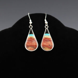 Zuni artist Diane Lonjose made these wonderful earrings. Made out of sterling silver and set with natural Spiny Oyster, Jet, and Turquoise. Zuni artists are known for their lapidary work. Weighs 8 grams. Signed 5/16″ wide x 2 7/8” tall Artist card included Zuni Pueblo is the largest pueblo in...