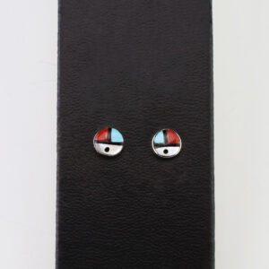 Fabulous sun face earrings by Zuni artist John Cheama. Made out of sterling silver and inlaid with Turquoise,Coral, Jet, and Mother of Pearl Shell. For the Zunis, the Sun symbolizes abundance, positive energy, happiness and peace. 1/4” in diameter Artist card included Zuni Pueblo is the largest...