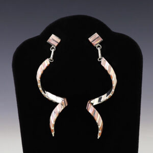 Zuni artist Shawn Sheyka created these amazing earrings. Made out of sterling silver and inlaid with Pink Mussel. Zuni artists are known for their lapidary work. Weighs 10 gram. Signed 13/16″ wide x 3 1/8” tall Artist card included Zuni Pueblo is the largest pueblo...