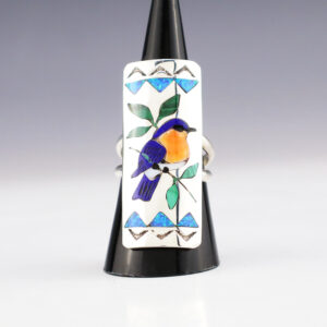 Zuni artist Quintin Quam made this beautiful Eastern Blue Bird ring. Zuni artists are known for their fine lapidary skills. Each stone is hand cut, polished, and set into a sterling silver setting. The ring is inlaid with Lapis, Malachite, Mother of Pearl Shell, Spiny Oyster, Laboratory Opal, and...