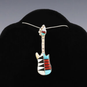 Stellar guitar pendant that features Turquoise, Coral, Jet, and Mother of Pearl Shell inlaid in a sterling silver setting. Hand made by Ola Eriacho from the Zuni Pueblo. Weighs 4 grams. Signed (Chain not included) 5/8” wide x 2” long Artist card included Zuni Pueblo is the...