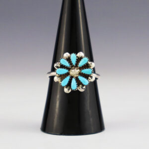 Zuni artists are known for their fine lapidary skills. Each stone is hand cut, polished, and set into a sterling silver setting. The ring is set with Turquoise stones. Hand made by Zuni artist Charlene Sice. Weighs 4 grams. Size 8. Signed 1/4″ wide Artist card included ...