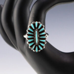 Zuni artist Dan Etsate made this beautiful Turquoise needlepoint ring. Zuni artists are known for their fine lapidary skills. Each stone is hand cut, polished, and set into a sterling silver setting. Weighs 8 grams. Size 7 1/4. Signed. 1 3/8” x 1 1/2″ Artist card included ...