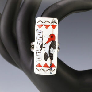 Zuni artist Quintin Quam made this outstanding Woodpecker ring. Zuni artists are known for their fine lapidary skills. Each stone is hand cut, polished, and set into a sterling silver setting. The ring is inlaid with Coral, Penn Shell, Mother of Pearl Shell, and Jet. Weighs 8 grams. Size 8....