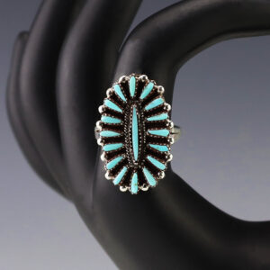 Zuni artist Yvette Kaamasee made this beautiful ring out of sterling silver and Turquoise. Great needlepoint design! Weighs 6 grams. Size 7 1/2. 1″ long Artist card included Zuni Pueblo is the largest pueblo in New Mexico, and because of its location, Zuni is the most...