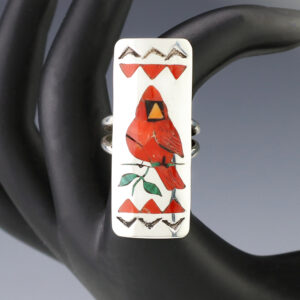 Zuni artist Quintin Quam made this lovely Cardinal ring. Zuni artists are known for their fine lapidary skills. Each stone is hand cut, polished, and set into a sterling silver setting. The ring is inlaid with Coral, Malachite, Spiny Oyster, and Jet. Weighs 10 grams. Size 7 1/2. Signed ...