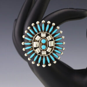 Zuni artist Dan Etsate made this beautiful Turquoise needlepoint ring. Zuni artists are known for their fine lapidary skills. Each stone is hand cut, polished, and set into a sterling silver setting. Weighs 8 grams. Size 7 1/4. Signed. 1 3/8” x 1 1/2″ Artist card included ...