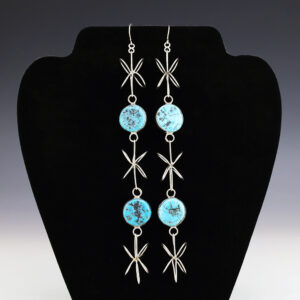 Zuni artist Carlo Lonjose made these gorgeous earrings out of sterling silver and natural Kingman Turquoise. These shoulder duster earrings will become a versatile accessory in your jewelry collection. Weighs 30 grams. Signed 13/16″ x 6 1/2″ With ear wires are 7 1/16” in length Artist card included...