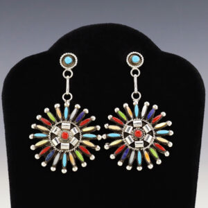 Each earring features Turquoise, Coral, Jet, and Mother of Pearl Shell set into a sterling silver setting. Hand made by Zuni artist Francine Chapito. These gorgeous earrings will become a versatile accessory in your jewelry collection. 1/4″ x 5/16″ Artist card included Zuni Pueblo is the largest...