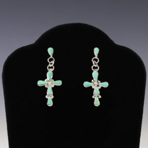 Zuni artist Rupert Shetima hand made these lovely cross earrings. Made out of sterling silver and inlaid with Turquoise. Weighs 4 grams. 9/16” x 3/4″ Artist card included Zuni Pueblo is the largest pueblo in New Mexico, and because of its location, Zuni is the most traditional. ...