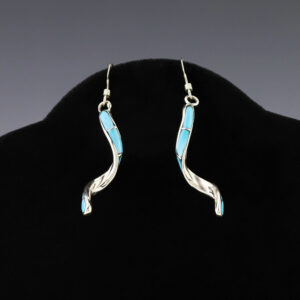 Zuni jewelry artist Ira Johnson hand made these lovely swirl earrings. Made out of sterling silver and inlaid with Turquoise. Weighs 4 grams. With ear wires are 1 13/16” in length 1/8” x 1 3/8″ Artist card included Zuni Pueblo is the largest pueblo in New Mexico,...