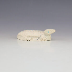 In prehistoric times, frog carvings appeared in jewelry. Zuni frog fetishes are associated with rain, abundance, and fertility. Hand made by Zuni fetish carver Reynold Lunasee, this darling frog fetish is made out of Dolomite with an inlaid Turquoise spots and Jet eyes. Signed 5/8″ tall x 1 5/16” long...