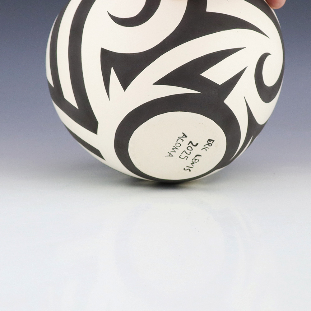 Brilliantly constructed by hand from natural clay, the pot is covered in intricate designs. Acoma potter Eric Lewis created this lovely seed pot. A unique addition to any pottery or Native American art collection. Signed