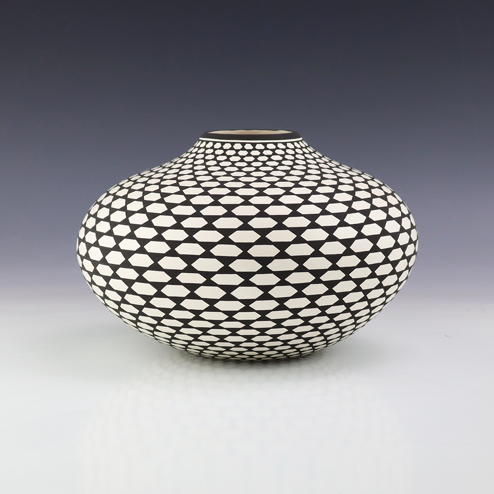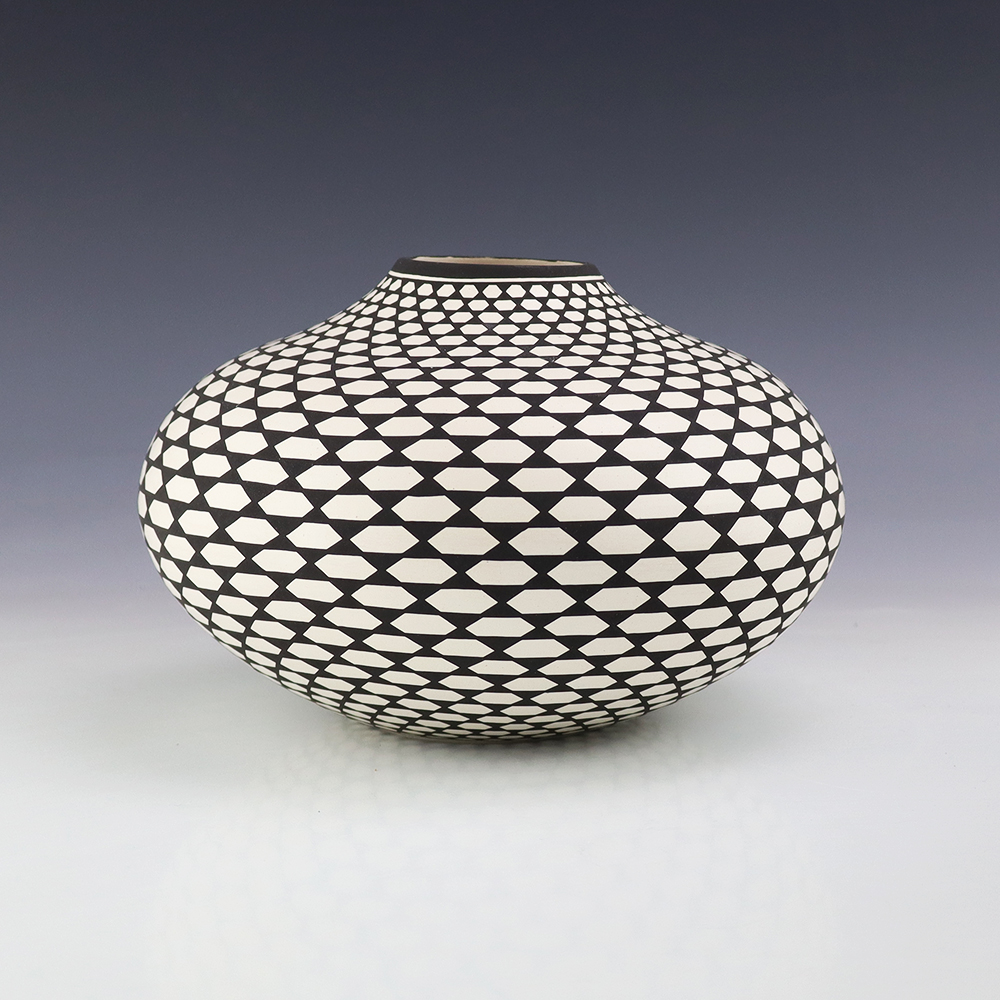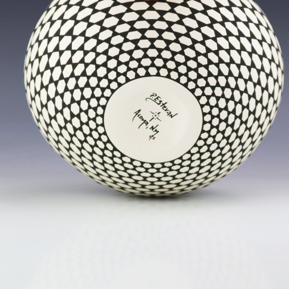 This eye dazzler was hand made by Acoma potter Paula Estevan. Paula was born in Acoma Pueblo in 1967. She learned the art of making pottery in the traditional way from her mother, Patricia Estevan, and from Mary Chino and Victoria Garcia. She’s been producing pottery since 1986. Paula’s hand coiled pots are exceptional examples of Acoma pottery with perfect shape and fine, thin walls. Her design process involves selecting a single Acoma design element and repeating it in an extremely fine progressive pattern across the entire surface of the pot. A unique addition to any pottery or Native American art collection. Signed