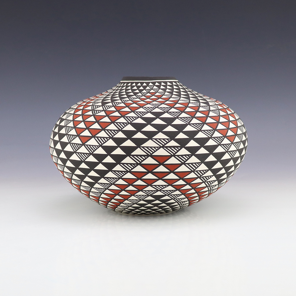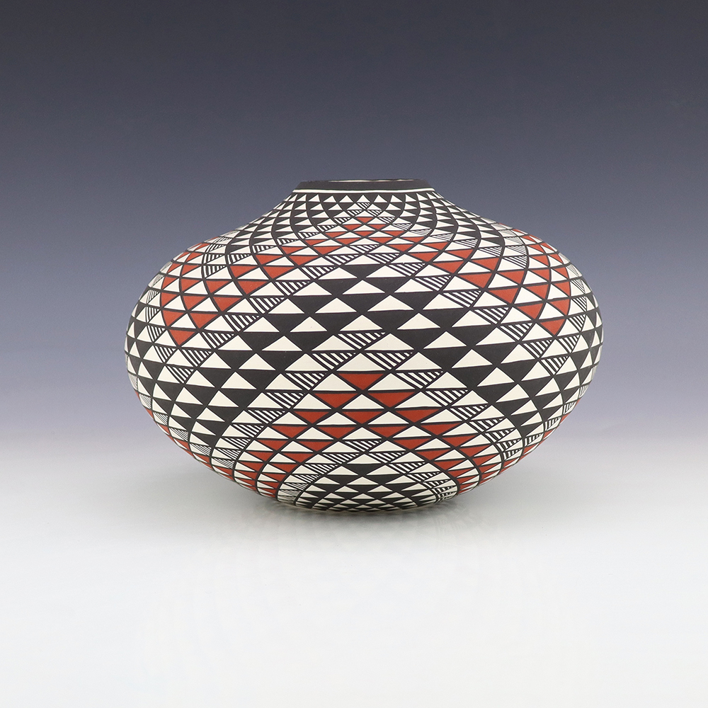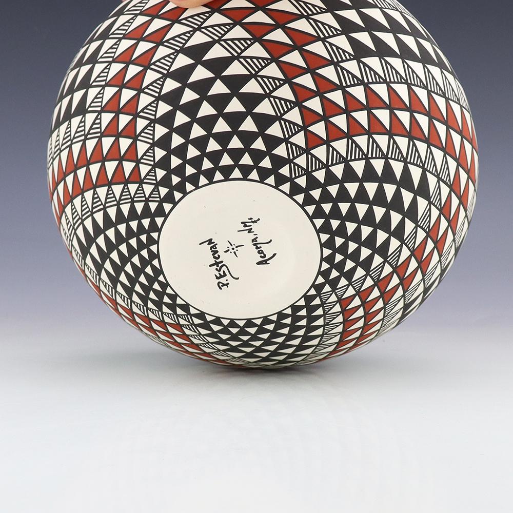This eye dazzler was hand made by Acoma potter Paula Estevan. Paula was born in Acoma Pueblo in 1967. She learned the art of making pottery in the traditional way from her mother, Patricia Estevan, and from Mary Chino and Victoria Garcia. She’s been producing pottery since 1986. Paula’s hand coiled pots are exceptional examples of Acoma pottery with perfect shape and fine, thin walls. Her design process involves selecting a single Acoma design element and repeating it in an extremely fine progressive pattern across the entire surface of the pot. A unique addition to any pottery or Native American art collection. Signed