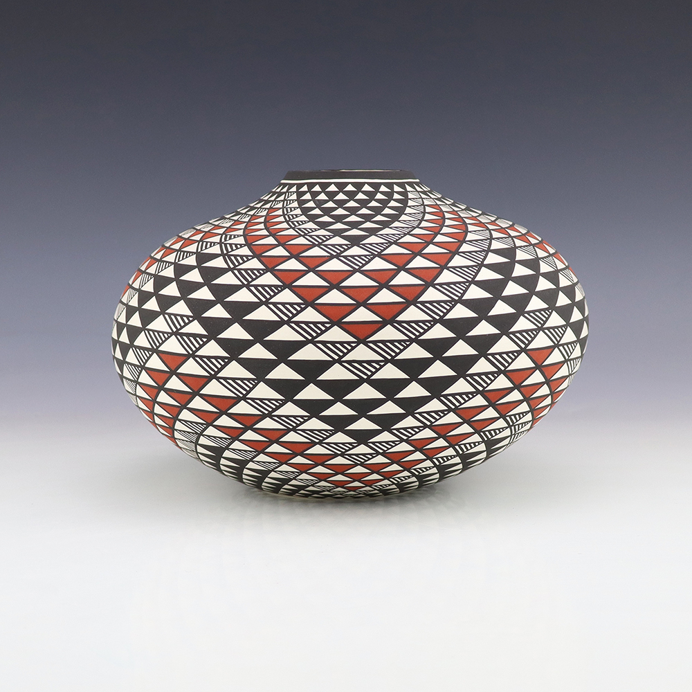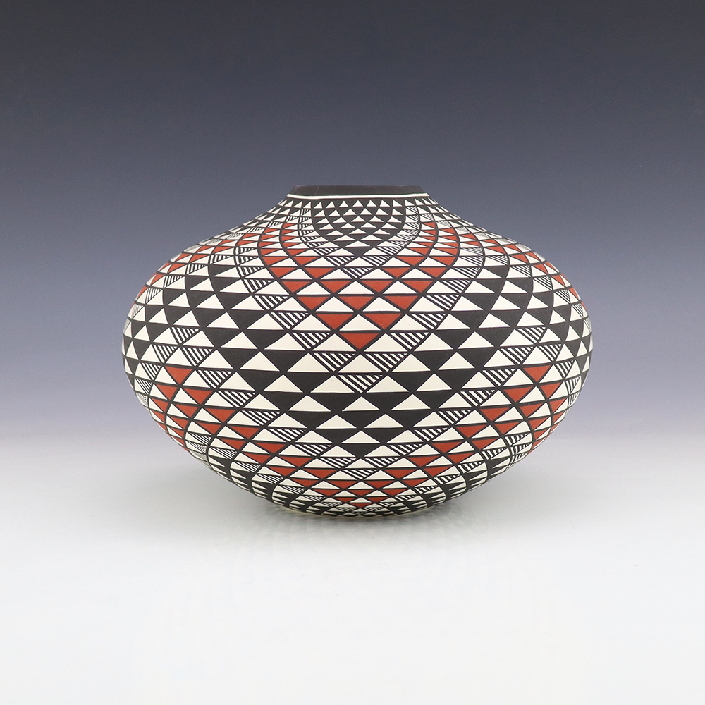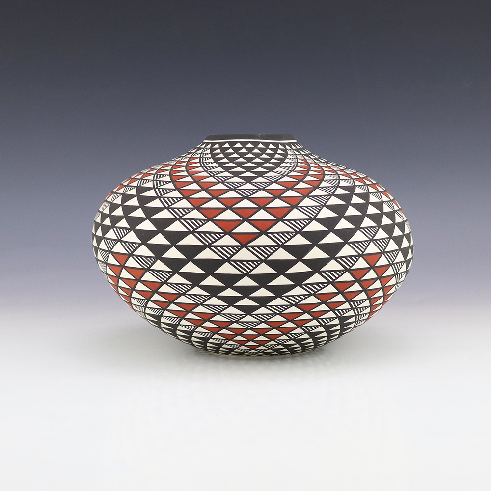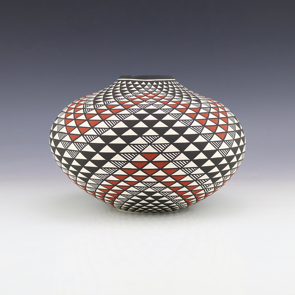 This eye dazzler was hand made by Acoma potter Paula Estevan. Paula was born in Acoma Pueblo in 1967. She learned the art of making pottery in the traditional way from her mother, Patricia Estevan, and from Mary Chino and Victoria Garcia. She’s been producing pottery since 1986. Paula’s hand coiled pots are exceptional examples of Acoma pottery with perfect shape and fine, thin walls. Her design process involves selecting a single Acoma design element and repeating it in an extremely fine progressive pattern across the entire surface of the pot. A unique addition to any pottery or Native American art collection. Signed