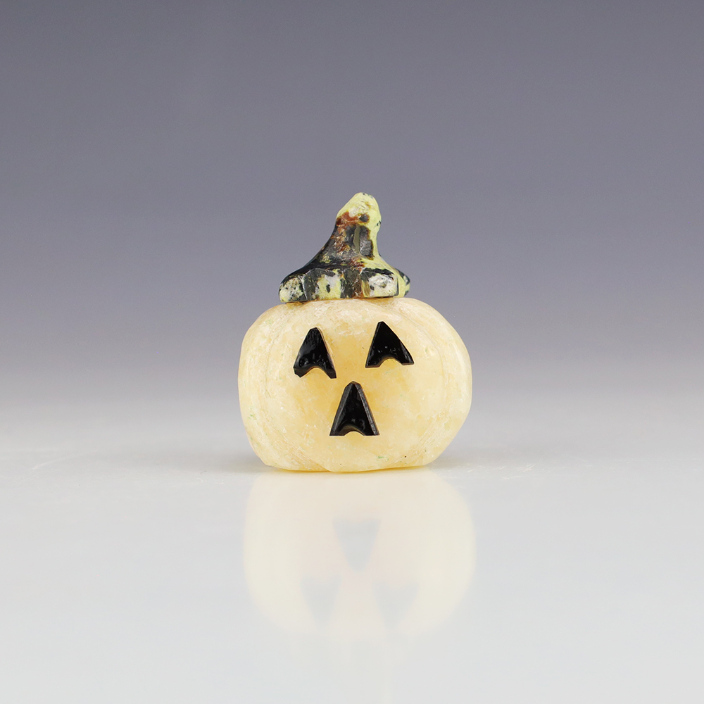 Zuni fetish artist Mike Tucson made this fantastic Jack O’ Lantern out of Alabaster, Serpentine, and Jet. A great addition to your Native American or Zuni fetish collection. Signed